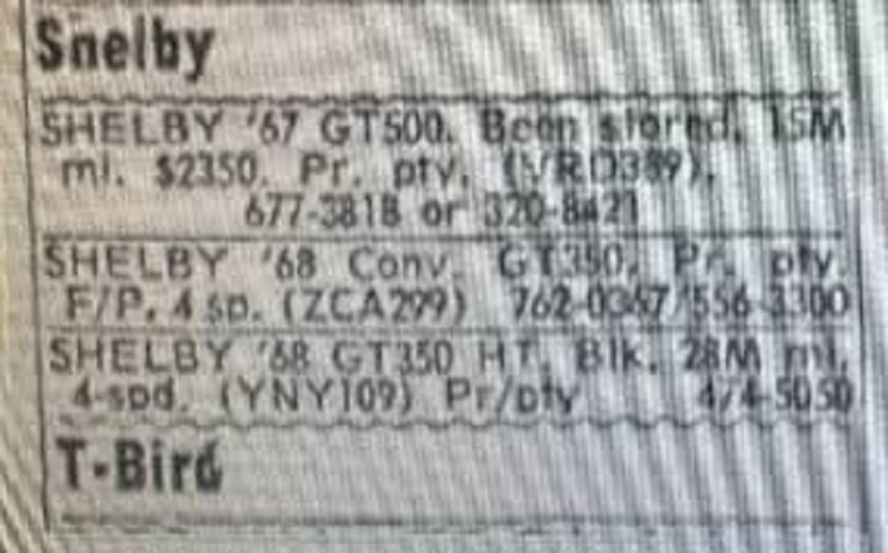 Naime, u njemu se spominje Shelby GT500 iz 1967. godine sa registarskim brojem VRO389, što je identičan model, godina i registracija kao ono što karakteriše „The Blue Lady“. Tražena cena je bila simboličnih 2.350 dolara (oko 16.048 „zelembaća“ u današnjoj vrednosti novca), čime još uvek živi nada da se automobil krije u nečijoj garaži.