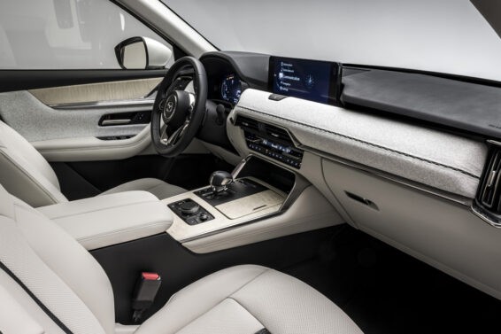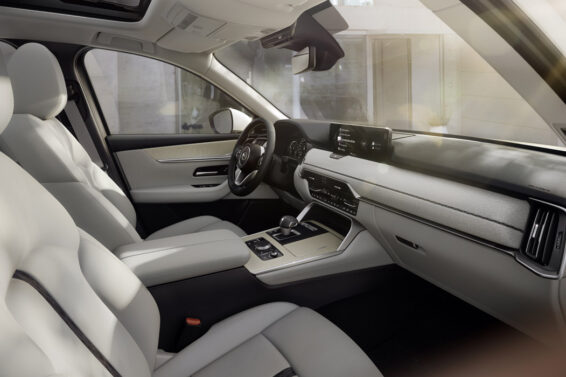 I tako, reč po reč, dođosmo do enterijera. Nova Mazda CX-60 i ovde nastavlja s promocijom već viđenog stila. Čeoni panel, potpuno virtuelna instrumentacija i središnji tunel deluju poznato, uz opasku da „ručica“ automatskog menjača više nije fiksirana. Ekran informativno-zabavnog sistema je širokougaoni i nudi dijagonalu od pozamašnih 12,3 inča.