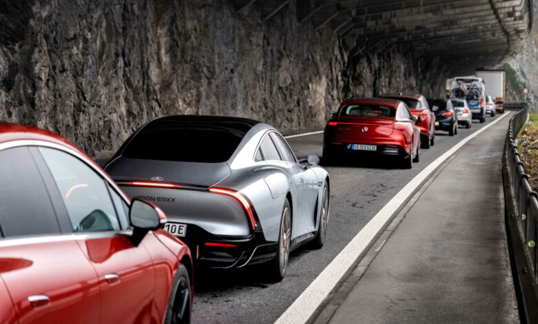 Dakle, Mercedesov električni adut morao je da pređe poprilično dug put, uz promenu nadmorske visine, zatim prolazak kroz gradove i upotrebu auto-puta. Put je startovao iz Nemačke, prolazeći kroz Štutgart (rano ujutru, pre gužve), da bi se zatim uključili na autoban.