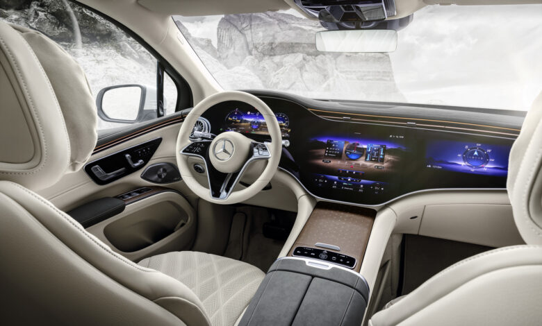 Što se tiče enterijera ovog električnog SUV-a sledi jedan deja-vu. Sve je to već viđeno na EQS-u, a Mercedes je suštinski samo prekopirao kabinu. Dakle, centralno uloga poverena je ogromnom Hyperscreen panelu. Dugačak je ukupno 1.410 mm, a inkorporira tri displeja (onaj ispred vozača i suvozača od po 12,3 inča, kao i centralni sa dijagonalom od 17,7 cola).