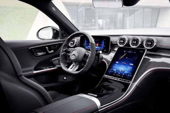Prelaskom u kabinu u prvi plan ulaze sportska sedišta AMG odeljenja presvučena veštačkom kožom i mikrofiberom. Monotonija se razbija kontrastnim crvenim štepom. Tu je i sportski upravljač, zasečen na donjem dolu, kao i MBUX informativno-zabavnim sistem koji se oslanja na dva displeja – jedan kao digitalnu instrumentalnu tablu i drugi na centralnoj konzoli.