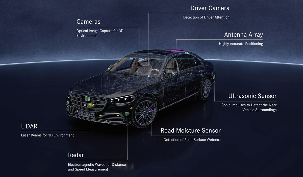 Tehnički posmatrano, Mercedesov autopilot trećeg nivoa autonomije se razlikuje od adaptivnog tempomata po prisustvu lidara koji je lociran u prednjoj oblogi. Povrh toga, ako je kod S Klase lidar s uspehom skriven u jednoj od ćelija rešetke hladnjaka, onda je on veoma upadljiv u oči kod baterijskog ekvivalenta s oznakom EQS. Zarad očuvanja simetrije, Nemci su postavili još jedan isti segment kako vizuelna ravnoteža ne bi bila narušena.