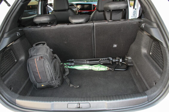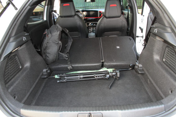 Sam prtljažnik je s 350 l na nivou spoljašnjih dimenzija, što je opet znatno manje od 2008 (435 l) i Croslland X (408 l). Obaranjem naslona dobija se preko 1.100 l, no dobijena površina nije ravna. Da bi se to ostvarilo negde pronađoh da je Opel predvideo policu na dva nivoa, po svemu sudeći uz doplatu. Drugo, da bi se otvorila peta vrata mora se prstima napipati prekidač negde ispod branika, osim što je prenisko smešten obavezno se isprlja po kišnom vremenu. U dnu pronađoh samo pribor za opravku guma, za utehu prostora ima za normalan rezervni točak, možda ne baš za jedan od 18 cola kao kod vožene…
