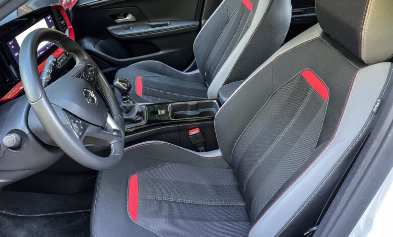 Sama sedišta su u teško opisivoj kombinaciji materijala, po obodu je tanak kaiš veštačke kože, dok je sedalni deo od 3-4 vrste platna. Bitnije od toga je da su dobro profilisana i prijatno tvrda, ali bez podešavanja za lumbarni deo. Što se tiče unutrašnjeg prostora treba opet naglasiti da nova Mokka kratka, ima recimo samo 8 cm više od prethodno vožene Mazde 2, koja pripada B segmentu. Iz tog ugla gledano prostor za putnike napred je za pohvalu, zahvaljujući sedištu i upravljaču s velikom amplitudom podešavanja prijatno se osećaju čak i veoma visoki vozači. U voženoj se nalazi i horizontalno podesiv naslon za desni lakat, zgodno prilikom dužeg putovanja, kojeg se Mokka 1.2 PureTech nimalo ne plaši…