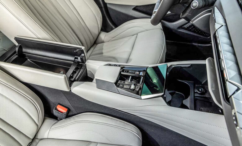 Obloge vrata su zaista originalne, na njima ne postoji vidljiv rukohvat već je integrisan u samu strukturu. Na vratima su i izduvi za vazduh (klima i grejanje), tako da na centralnoj konzoli ni ne vidite te nepreterano elegantne rupetine. Desni lakat položen je na široki oslonac, ispod koga je veliki hlađeni boks. Za odlaganje sitnica predviđen je još jedan na širokom centralnom tunelu, pored „ručice“ automatskog menjača, evidentno iste kao kod Peugeota 308. Poseduje poklopac kako bi se sakrile odložene sitnice, pored dve konzerve s osvežavajućim pićem u njega staje i smartfon, sa predviđenim mestom za beskontaktno punjenje.