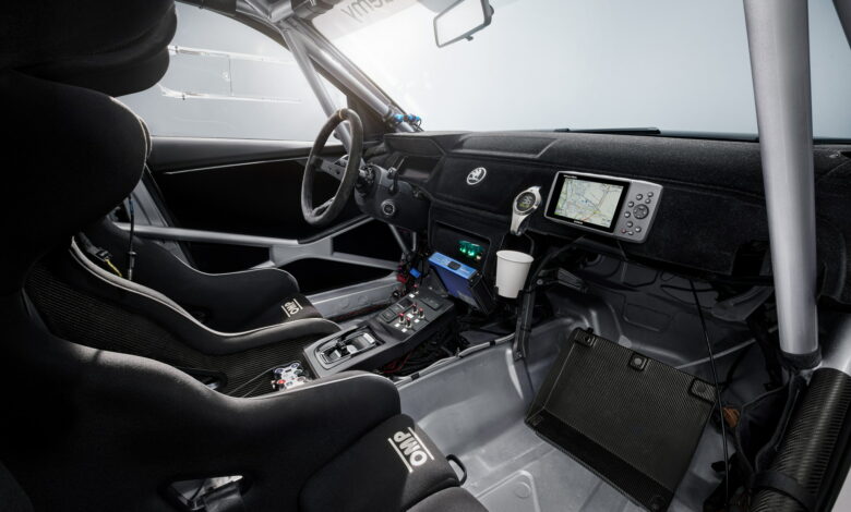 Što se tiče enterijera – spartansko uređenje! Nema tu ničega nepotrebnog, sve je podređeno svrsishodnosti. Zaboravite na silne displeje, jedini ekran koji ima realnu funkciju (pored instrumentalne table) je ispred suvozača i u pitanju je navigacija marke Garmin. Vidimo da su Škodini đaci upakovali i sportska sedišta, te da su ogolili kabinu, a primećuje se i rol kavez.