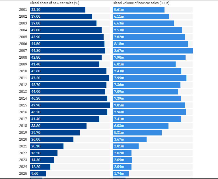Čini se da je sunovrat na evropskom tržištu automobila pogonjenih dizel motorima nezaustavljiv u poslednjih nekoliko godina. Svoje viđenje i prognoze s ovim u vezi je izneo i Al Bedvel kao jedan od direktora kuće LMC Automotive, onaj čije su ingerencije u analizi tržišta spram ponuđenih pogonskih sklopova.