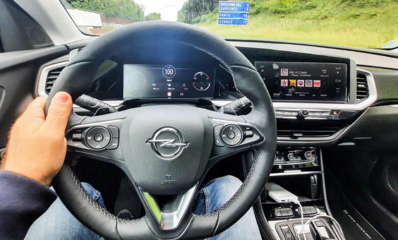 Bez obzira na zajedničke gene Grandland i 3008 nemaju istu ciljnu grupu. Peugeot do maksimuma igra na kartu modernizma, njegova futuristička unutrašnjost, s minijaturnim upravljačem, numeričkim instrumentima i ručicom automatskog menjača u stilu džonstika, po ukusu su mlađe populacije. Opel je u poređenju s njim znatno diskretniji, kroz njegov veliki upravljač savršeno se dobro vide sada numerički instrumenti, koji su zamenili nekadašnje analogne s klasičnim kazaljkama. Radi se o tzv. „Pure Panel“ instrument tabli preuzetoj iz Mokke, dakle velikom ekranu od 12 inča s raznovrsnom grafikom.