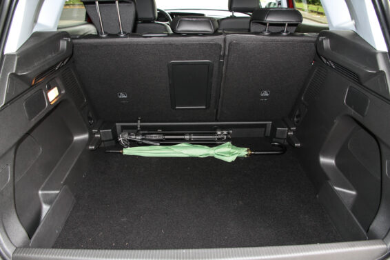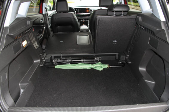 Prtljažnik je isto tako slične zapremine, s podignutim naslonima zadnje klupe iznosi 514 l (390 l kod hibridne verzije), odnosno 1.652 l kada se ovi obore. Naravno da je i ovde primenjena „caka“ sa podesivom policom kako bi se dobila ravna površina, s tim da je u voženoj verziji nije bilo!? Ne pronađoh da li se radi o opciji za koju se doplaćuje ili ju je neko pre mene „maznuo“… U dno prtljažnika staje guma istih dimenzija, no kao što možete videti na fotografijama u voženom modelu je nije bilo. Peta vrata i ovde mogu biti potpomognuta električnom asistencijom, odnosno otvoriti se i zatvoriti podvlačenjem stopala ispod branika.