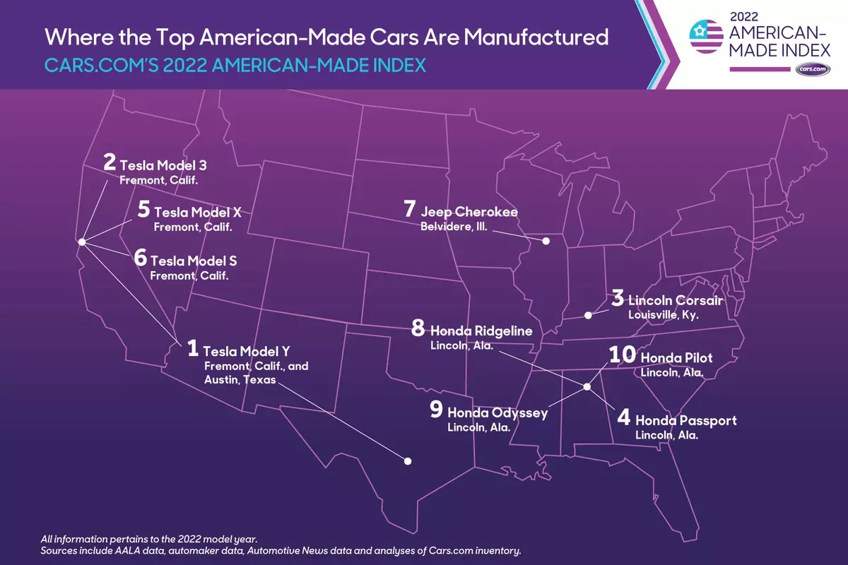 Kolege sa sajta Cars.com svake godine prave listu „najameričkijih“ vozila, i to analizirajući pet kategorija. One su lokacija konačnog sklapanja, zatim gde se proizvode njegovi delovi, poreklo motora i menjača, i na kraju koliko domaćih radnika je zaposleno u toj fabrici.