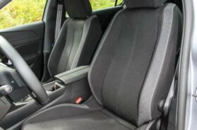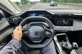 Naprotiv, upravljač je više manje isti, obložen kožom (veštačka ili ne vrag će ga znati), preko koga se gleda na instrumente. I ovde ih jednim delom zaklanja, no ovo nam je odavno poznato, takozvani „i-Cockpit“ zahteva kompromise. Sva sreća te je sedište s ekstremno velikom amplitudom podešavanja, bez obzira na korpulenciju vozač ga može spustiti dovoljno nisko kako bi se prijatno osećao.