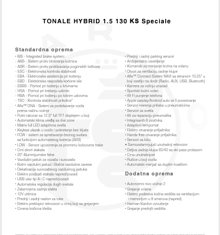 Mada zvanična pomocija za Srbiju još nije održana, a ni cene nisu zvanično objavljene, u izložbeno-prodajne salone Alfe Romeo je stigao novi krosover Tonale, u promotivnom paketu opreme Speciale Edizione, sa motorom indeksiranim kao 1,5 MHEV, snage 130 „konja“ (od motora SUS) i dodatnih 20 „grla“ (koje dodaje elektromotor).