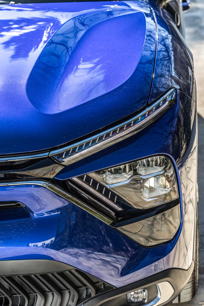 Biće kako bude, hajde da vam ukratko opišem zapažanja u vezi izgleda, iako fotografije govore same za sebe. Već na prvi pogled rekao bih da je C5 X pokupio mnoge stilske elemente manjeg C4, po ugledu na njega znak ševrona i ovde je integrisan u prednju masku, s hromiranim lajsnama koje se protežu naviše i naniže. U gornjem delu su integrisana elegantna LED dnevna svetla, dok je u donjem „komplikovana“ i nadasve originalna svetlosna grupa sastavljena iz 3 modula.