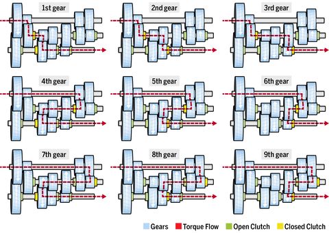 Na slici je prikazan način povezivanja i protok snage kroz menjač za svaku od devet brzina. Dakle, ručica menjača u automobilu daje „input“ sistemu koju brzinu da odabere. Ali ni to nije tako jednostavno, jer ručica menjača ima samo 6 stepeni prenosa koji se mogu koristiti, a ipak je dostupno svih devet brzina. To je postignuto softverskim upravljanjem i kroz izbor tri režima rada menjača: Track, Normal i Comfort.