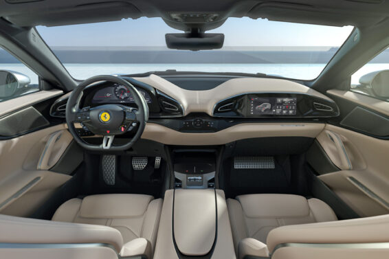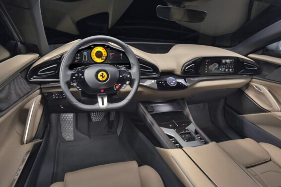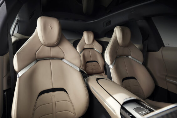U kabini se nalaze četiri odvojena sedišta, fotelje moglo bi se reći, a sva su ona opremljena električnim pogonom. Poštuju se tradicije modernih Ferrarija: na volanu se nalazi prekidač za opredeljivanje željenog režima vožnje („manettino“), kontrola rada farova i pokazivača pravca, a na centralnom tunelu su minijaturni selektori. Konstruisani su pod prorezima klasične „mehanike“ i odgovorni su za rad menjača.