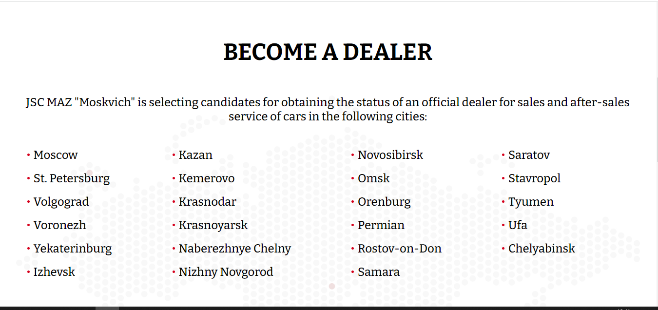 U ovom trenutku je izbor aktuelan samo na teritoriji 23 najveća grada Ruske Federacije, a koja su to mesta u pitanju, može se propratiti na novouspostavljenom sajtu Moskviča. Fabrika će izabrati partnerske kompanije koje će u spektru delatnosti obavljati i funkciju prodaje i servisiranja četvorotočkaša s Moskvičevim nalepnicama. Jedan od obavezujućih uslova koje je postavio novi proizvođač tiče se spremnosti za uspostavljanje infrastrukture za električna vozila. Procedura prijava zainteresovanih entiteta će biti otvorena do 21. oktobra.