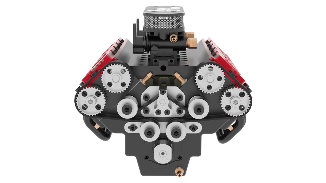 Naravno, mališan ne urliče i ne divlja kao što to čine automobilski motori u V8 rasporedu, oni koji se s kubikažom kreću u intervalu između četiri i čak deset litara. Ali, zato veći broj obrtaja razvija ovja Mini-V8. I to mnogo veći, što je imperativ kako bi se oslobodila koliko-toliko pristojna snaga, a prema deklaraciji proizvođača, pričamo o 4,35 „konja“ pri 11.200 o/min. Ograničenje broja obrtaja kolenastog vratila je postavljeno na 12.500 o/min. Kroz minijaturni karburator, koji je podržan pumpama, protiče mešavina benzina i 25 do 30 % „goriva za male modele“, tačnije: nitrometana.