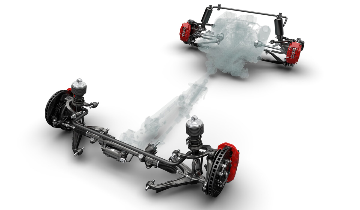 Zadržana je potpuno upravljiva šasija, dok je prednji trag točkova proširen za 30 milimetara, a zadnji za cela 34 mm. Umesto uobičajen pneumatika koji su superiorni na asfaltnoj podlozi i koji dolaze s oznakom Pirelli P Zero, montirane su gume namenjene eksploataciji na svim terenima. Ove jedinice nude uvećani profil i nose ime Bridgestone Dueler AT002. Dolaze u dimeniziji 235/40 R19 na prednjoj osovini, dok su „koleginice“ sa zadnje osovine veličine: 285/40 R19.