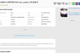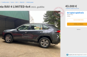 Šetajući internetom naiđosmo na sajtu „Polovni autimobili“ oglas za tek prodato vozilo. U pitanju je oglas (broj 20877192) za potpuno nov Toyotin klasičan hibrid RAV 4 s pogonom na sve točkove, u opremi LIMITED, 2022. godište, s prevaljenih samo 10 kilometara, koji je svim zainteresovanim kupcima bio ponudjen po ceni od 43 hiljade evra.