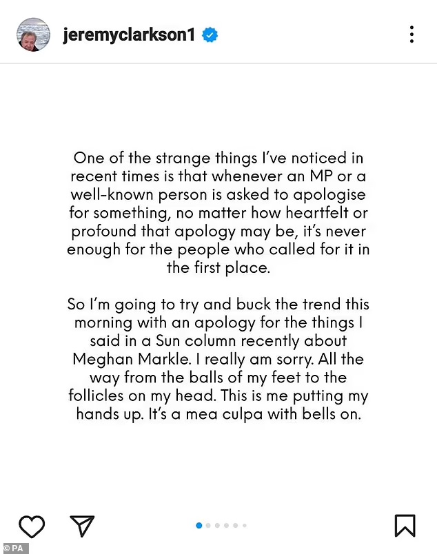 Klarkson je kasnije kontaktirao Megan i njenog supruga Harija, a uputio je i javno izvinjenje preko društvene mreže Instagram. Tu se pravdao kako je upravo završio gledanje jedne od epizode serije „Igra prestola“ i da su mu takve reči pale na pamet nakon toga, ali da nikada nije prozivao na nasilje. The Sun će reći da je dobio preko 25 hiljada žalbi na dan kada je ovaj rečenica završila u medijima, uz još dodatne tužbe što su dozvolili Klarksonu da je objavi.