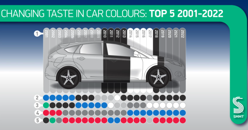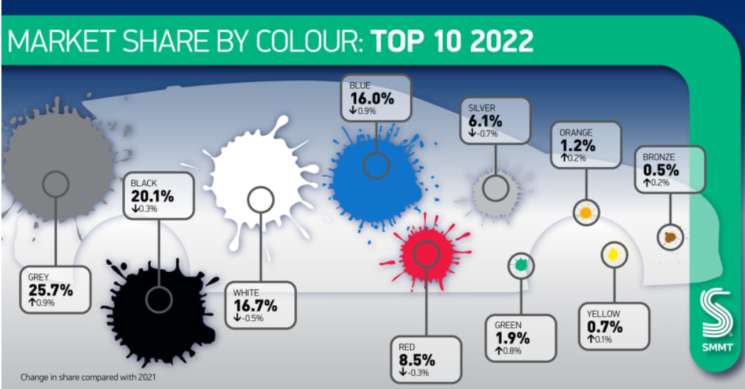 Zajedno, te tri opcije boja činile su 62,5 odsto svih automobila prodatih u Velikoj Britaniji. Neko može da pomisli da su siva i njoj slična srebrna boja grupisane u jedan koš, naduvajući brojeve. Srebrna je zapravo zauzimala 6,1 odsto tržišta, zauzimajući ukupno šesto mesto iza plave (16 odsto) i crvene (8,5 odsto).
