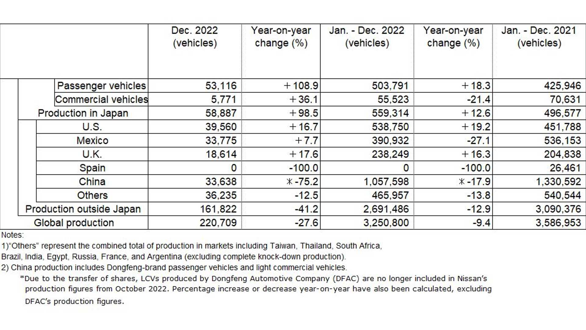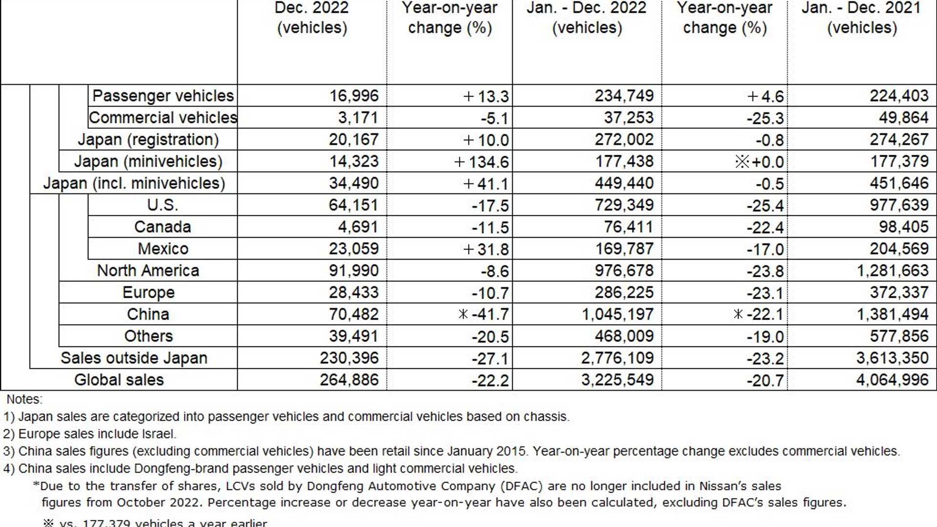 Globalna prodajna postignuća kompanije Nissan su tokom 2022. godine bila za 20,7% lošija u odnosu na zabeležena u godini koja je prethodila. Kada se apsolutni pokazatelji svedu na naturalne, proizilazi da je u prošloj godini isporučeno 3,23 miliona primeraka Nissana. Logično, opao je i broj proizvedenih vozila, uglavnom stoga što proizvođači slede princip usklađivanja obima proizvodnje s tražnjom, odnosno poštuju takozvano pravilo „just in time“.