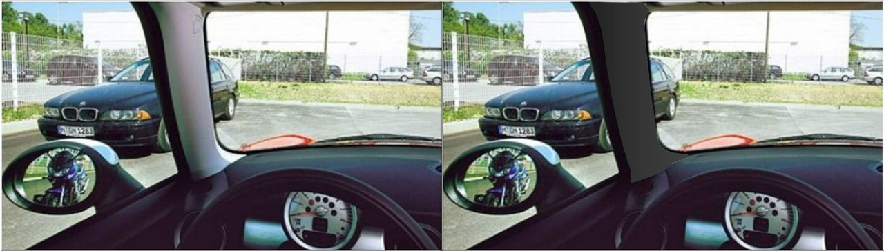 Ovde je primer kako boja enterijera – narocito u zoni prednjeg stakla! – moze da utice na vidljivost a time direktno na bezbednost voznje. Na slici je poredjenje vidljivosti iz jednog istog automobila: levi ima svetlu oblogu A nosaca koja se opticki stapa sa okolinom a desni ima tamnu oblogu A nosaca cime se dobija jak kontrast izmedju enterijera i okoline, sto pomaze vozacu da se fokusira na okolinu!