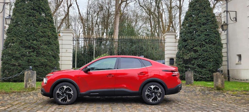 Iz profila gledano deluje pre kao nekakav „kupe-krosover“ nego li klasičan sedan, verovatno i zbog povišenog klirensa (15,6 cm) i velikih proreza za točkove, uokvirenih crnim zaštitnim plastikama koje se protežu na pragove i donji deo prednjeg i zadnjeg branika. Spomenimo i gume, visokog profila (690 mm), što nam sugeriše da se radi o vozilu sposobnom napustiti asfaltirane puteve! Što se tiče dimenzija s 4,36 m, koliko ima C4, novi C4 X izdužio se na čitavih 4,6 m, čime je bezmalo na pragu D segmenta, iako počiva na platformi modela u B segmentu…