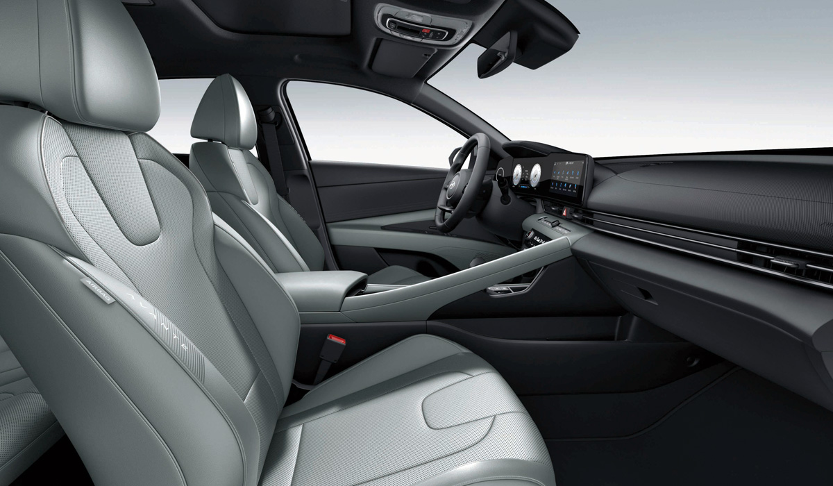 Nije bilo novina u putničkoj kabini, barem što se najava tiče. Na isti zaključak navodi i analiza priložene fotografije enterijera. Model Elantra/Avante i dalje poseduje ona ista dva ekrana s dijagonalom od 10,25 inča koji su montirani na čeonom panelu. S druge strane, nova verzija trima koji je u kabini poseduje svetlo zelenu presvlaku, a to je materijal koji sadrži visoko učešće recikliranih komponenti.