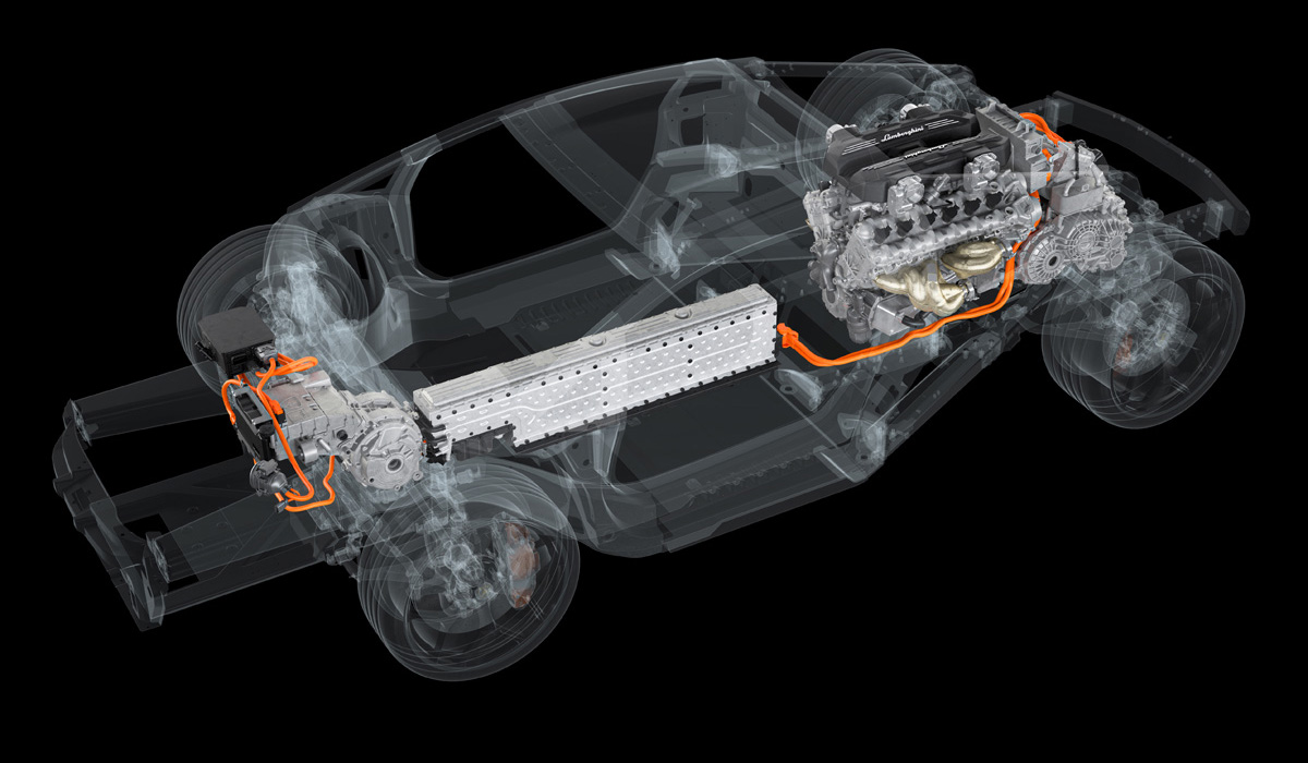 Uzgred budi rečeno, menjač ne nudi opciju vožnje unazad. Novi Lamborghini će ipak moći da ide u rikverc, ali samo uz pomoć elektromotora. Kada je baterija puna, to je dovoljno za desetak kilometara bešumne vožnje (u bilo kom pravcu, da se našalimo malo). Osnovna postavka podrazumeva da su motori montirani u prednjem kraju odgovorni za kretanje na struju, pa tako dobijamo nestvarni Lamborghini s prednjim pogonom, ali elektronika može prepoznati klizavu podlogu i nuždu aktivacije integralnog prenosa snage, pa ako ima dovoljno „soka“ u bateriji, sistem će u priču uključiti i električni agregat pričvršćen nazad. Ili će se pak opredeliti da se osloni ma V12…