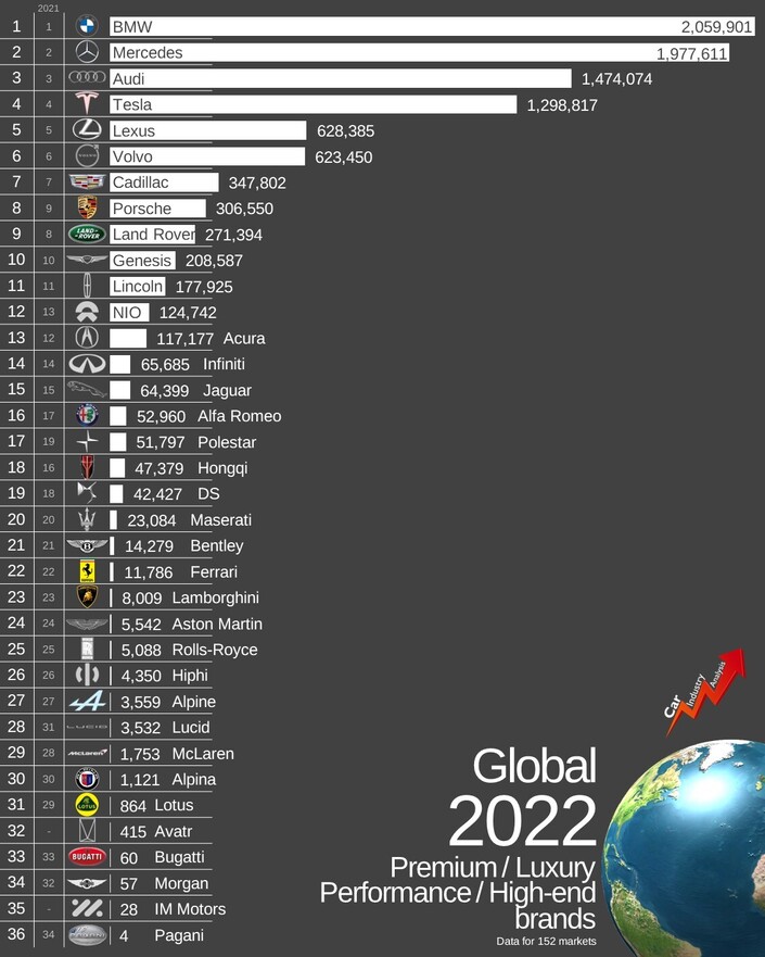 Specijalisti za analizu automobilske industrije pokušali su da sakupe sve podatke o prodaji premijuma, luksuznih i ultra-sportskih brendova automobila prošle godine u svetu. Koristeći podatke prikupljene sa 152 glavna tržišta automobila na planeti, došli su do glavne rang liste od 36. prestižnih marki automobila. Nije iznenađujuće da BMW dominira sa svojih više od dva miliona prodatih automobila prošle godine, omogućavajući mu da pobedi Mercedes (1,98 miliona) i Audi (1,47 miliona). Ali tu su još neke zanimljive bitke na ovoj rang listi.