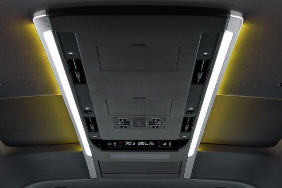 A na krovu je sada dodata jedna jedinica koja se zove Super-Long Overhead Console. Koncentriše na jednom mestu deflektore za ventilaciju, kontrolu klime, senke za osvetljenje, pa čak i dugmad električnih prozora. Levo i desno od ove „konzole“ su ugrađeni stakleni delovi sa pojedinačnim kapcima. A bočni prozori su opremljeni novom vrstom roletni koje se spuštaju (uz pomoć serva, naravno) i pokrivaju čitavu staklenu površinu. Minivanovi su opremljeni Toyotinim elektronskim pomoćnicima Safety Sense.