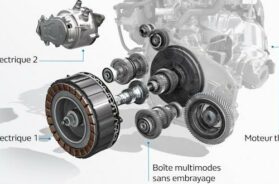 Ponovimo još jednom, Renault je ovde primenio rešenje iz Formule 1 i uveo takozvani „dog-clutch“ automatski mjenjač, s četiri prenosna odnosa za benzinski blok, i još dva kada je u električnom modu. Ukratko, jedan od elektromotora (slabiji), koji ne pokreće točkove, između ostalog zadužen je za sinhronizaciju prenosa.