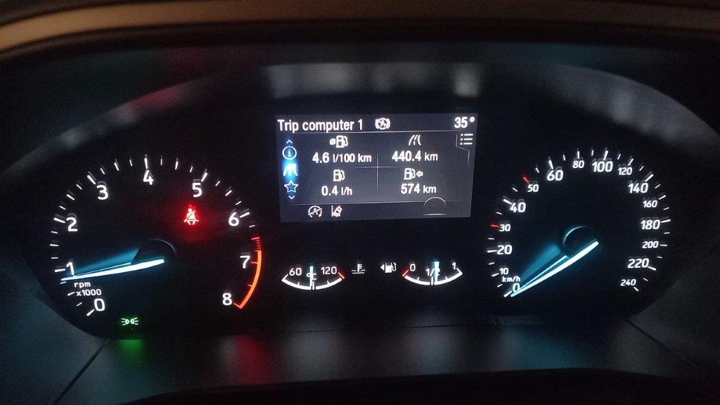 Instrument tabla jeste analogna, sa 4.2“ digitalnim ekranom putnog računara smeštenim centralno. Moglo bi možda da se zameri zašto i u ovom nivou opreme u 2023. godini ta tabla nije digitalna, kao što je u nekim višim nivoima opreme. Ali, ako ćemo da cepidlačimo, zašto da ne kažem i da meni nije jasno ni zašto aktuelni BMW serije 1 i danas standardno ima analognu instrument tablu, dok opciona virtuelna ima cenu od neverovatnih 2.150 evra. Pri čemu meni ova analogna iz Forda deluje lepše od one analogne iz BMW-a serije 1. Naravno, sve je to samo stvar moga (ne)ukusa. Sem toga, ova instrument tabla je dosta čitljiva, sa lepim fontom.