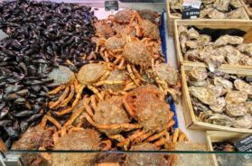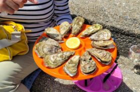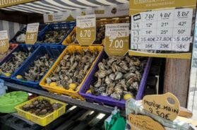Podrazumeva se i da ih svi restorani imaju u meniju ali ovako je zanimljivije i neuporedivo jeftinije, iako su poskupele od prošle godine na štandovima lokalnih uzgajivača jedno tuce (12 komada) košta 8 evra! Za neupućene, ostrige su žive, otvore vam ih i serviraju na platou s limunom, dovoljno je staviti par kapi istog i popiti ih, nakon što se otkače od centralnog spoja s ljušturom. Ukoliko ih niste nikad probali preskočite ovakav način konzumiranja, za početnike bolje je staviti istovremeno u usta dosta hleba namazanog puterom.