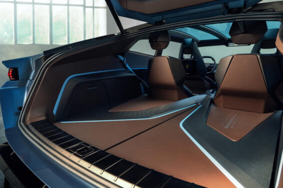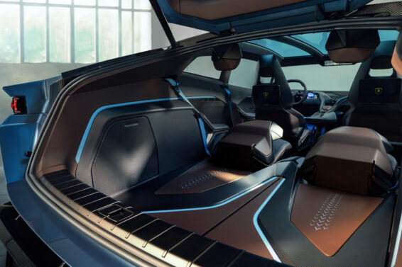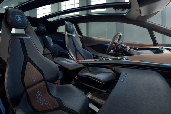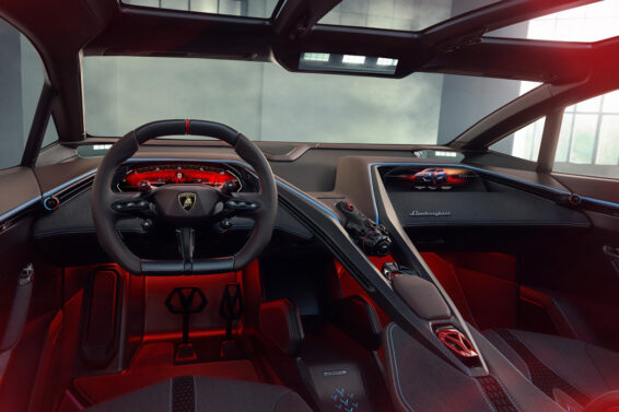 Dva su glavna ekrana pričvršćena na centralnom grebenu u unutrašnjosti egzotika, pa se jedan nalazi pred očima vozača a drugi više gravitira ka kopilotu. Dodatnih je tri komada i oni su tu umesto uobičajenih retrovizora. Panoramski krovni otvor sadrži tri uzdužno postavljene sekcije. Taster za pokretanje pogonskog sklopa, inače tradicionalan za marku Lamborghini, je skriven ispod površine i kao takav je očigledno zadržan.
