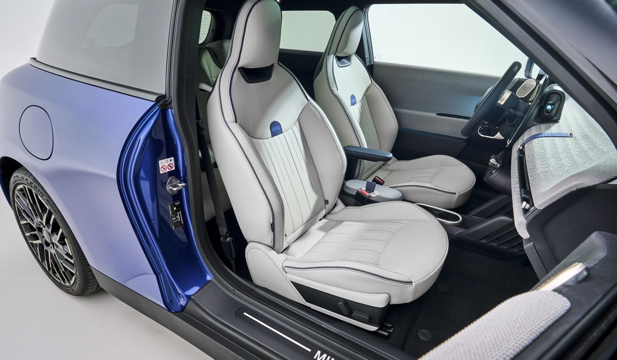 Četiri nivoa opreme su predviđena i ona nose nazive Essential, Classic, Favoured i John Cooper Works. Razlikuju se po elementima dekora (pri čemu poslednje naveden promoviše atletski duh). Mini se odrekao prirodne kože, pa su svoju primenu našli brojni reciklirani materijali, uglavnom odbačene plastične flaše. Prednja sedišta mogu biti sportska ili standardna.