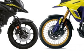 Verzija „Dual Explorer“ (DE) V-Stroma 1050 je dostupna postala tek od 2023. godine, i to s prednjim točkom dimenzije 90/90-21 i nešto dužim hodom vešanja. V-Strom 650, s druge strane, nikada nije bio dostupan sa prednjom felnom od 21 inča, već samo s devetnaesticama,i to samo kao varijanta XT sa žičanim prednjim točkom koji integriše gume bez unutrašnje, takozvani tjubeles.