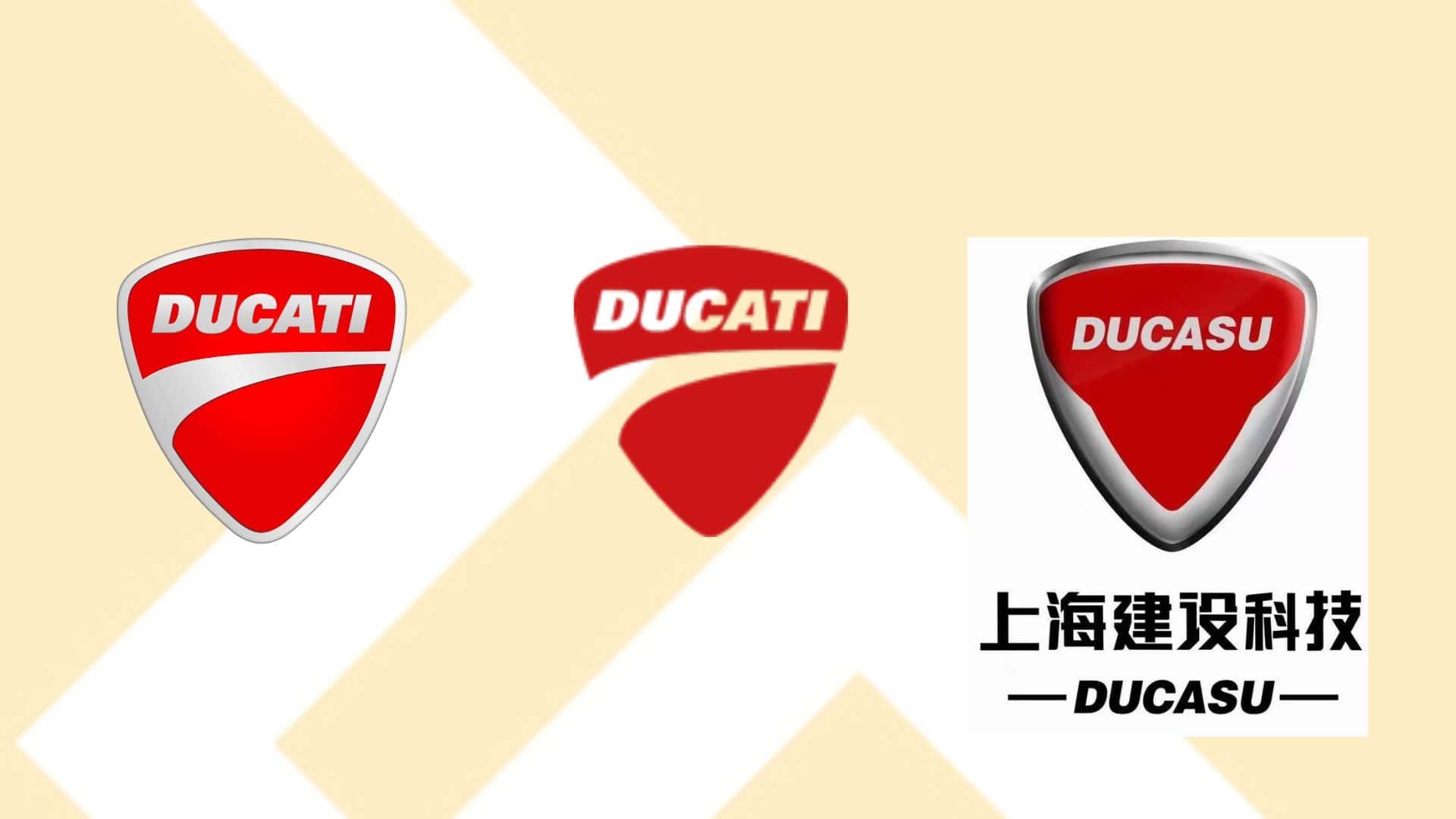 Zanimljivo je uporediti i ambleme dve firme. Ducati je, baš kao i mnogi drugi stari proizvođači, izmenjao više stilova i različitih grbova brenda, pa može biti dobro podsetiti se kako je to izgledalo kroz godine. Na dizajn logotipa Ducasua su sasvim izvesno najveći uticaj ostvarila dva grba Italijana koja smo prikazali u donjoj slici. Primetićete da je čak i izbor fonta besramna kopija, baš kao i oivičenje trouglastog amblema.