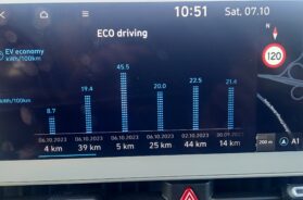 Naravno, na info displeju ćete primetiti da se i preostali domet vozila menja kako vi menjete pomenute postavke, ali, nisu to neke dramatačine razlike, već negde u rasponu 5-10% dometa. Na sličan način, domet se menja i zavisno od rada klima uredjaja, ali, tokom testa napolju je tokom dana bila idealna temperatura (oko 23-24 stepena), u kojim uslovima klima uredjaj troši minimalnu količinu struje, pa nisam mogao da sagledam realno uticaj rada klima uredjaja na domet pri nekim većim ili manjim spoljnim temperaturama.