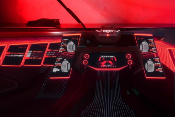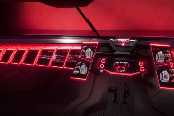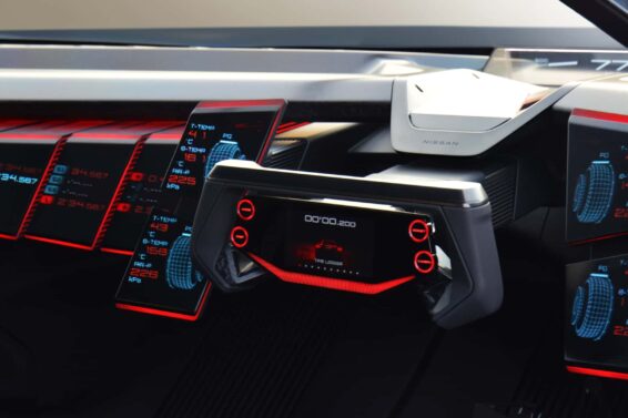 Što se tiče enterijera, osećaj je kao video igrama sa obiljem LED dioda. Pošto je Nissan zamislio koncept kao mašinu usmerenu na stazu (otuda i brisač na sredini vetrobranskog stakla), on zamenjuje okrugli volan trkačkim jarmom.