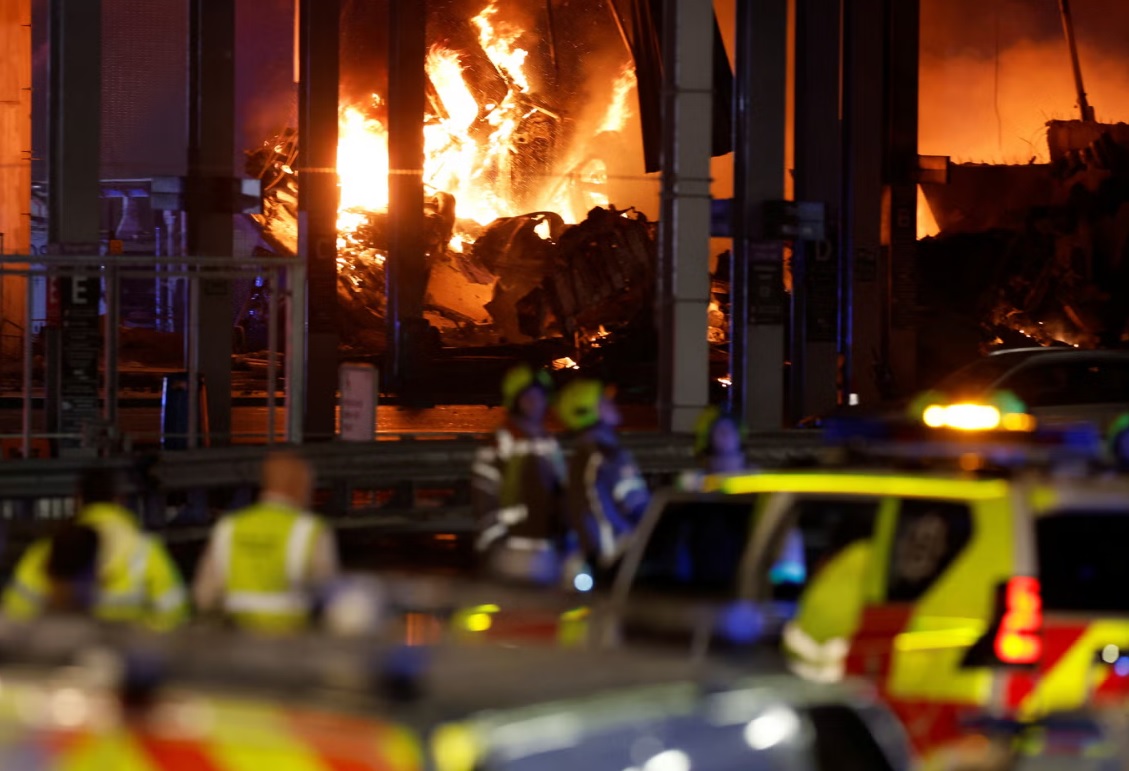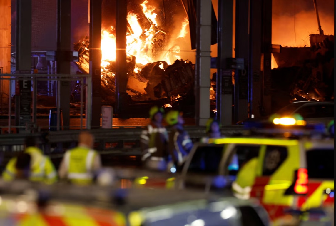 Kako je temperatura plamena postigla veoma visoke vrednosti od preko 600 stepeni Celzijusa, došlo je do urušavanja metalne konstrukcije parkinga i širenja vatre na druge nivoe. Preko stotinu vatrogasaca berdfordširske vatrogasne brigade je gasilo požar čak dvanaest sati. Vatra je izbila na novom parkingu terminala 2. Parking nije imao protivpožarnu zaštitu u vidu prskalica vodom sa plafona.