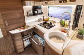 Liner 1090 GIO ima kuhinju u obliku slova U između prednjeg životnog prostora i spavaće sobe. Sa jedne strane ima frižider i ostavu, a sa druge umivaonik, prostor za pult i ploču za kuvanje. Takođe postoji dovoljno prostora za skladištenje iznad i ispod kuhinjskog prostora.