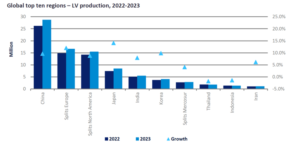 Ukupna proizvodnja lakih vozila u Kini zauzima prvo mesto u svetu četrnaest uzastopnih godina i očekuje se da će činiti 32% ukupne globalne proizvodnje u ovoj godini. Proizvodnja i prodaja električnih vozila i priključnih hibrida su na prvom mestu u svetu osam godina zaredom. Kao što se može videti iz grafikona u nastavku koji prikazuje deset najboljih regiona kada je u pitanju proizvodnja lakih vozila u svetu, kineska proizvodnja je dostigla 1,7 puta veću od Evrope, koja je na drugom mestu.