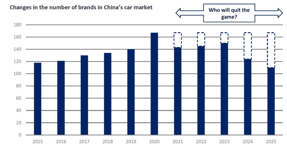 Proizvođači originalne opreme (OEM) bez vrednosti brenda, oni koji se bave osnovnim tehnologijama i razvojni kapital propadaće jedan za drugim. Tradicionalno tržište automobila je sada ušlo u fazu konsolidacije. Prema lokalnim statistikama, neki brendovi su poslednjih godina bili primorani da se povuku sa kineskog tržišta automobila. To uključuje Zotye, Lifan, Borgward, WM, AIWAYS, Mitsubishi, Renault, Acura i druge. Svi su bili primorani da napuste scenu zbog velike konkurencije.
