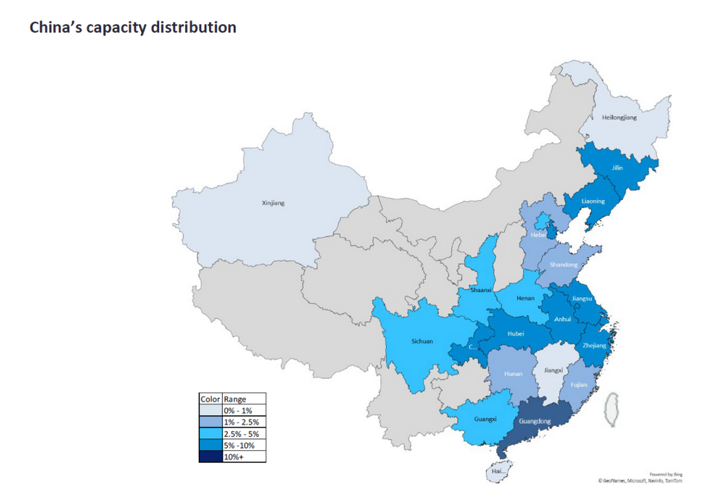 Sveukupno, prema statistici, u Kini postoji oko 241 proizvođač automobila, od kojih se očekuje da će oko 20% proizvesti manje od 1.000 jedinica u 2023. godini, a oko 17% njih će proizvoditi manje od 10.000 jedinica godišnje. S druge strane, skoro 15% fabrika će imati stopu iskorišćenosti kapaciteta veću od 95% u 2023. godini, a njihova ukupna proizvodnja će činiti 47% ukupne proizvodnje ove godine. Značajan broj ovih preduzeća ima probleme sa viškom kapaciteta. Takođe se iz ukupne kineske distribucije proizvodnih kapaciteta može videti da je velika količina koncentrisana u obalnim oblastima sa razvijenom privredom.