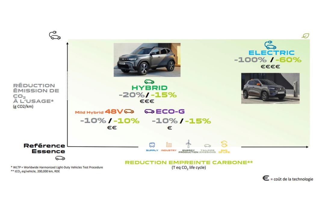 Jedna od prednosti TNG-a je smanjenje emisije CO2. Neophodno ključna tačka danas, a ne samo za borbu protiv globalnog zagrevanja. Automobilski brendovi takođe moraju da ispunjavaju sve strožije ciljeve u ovoj oblasti, inače se suočavaju sa velikim novčanim kaznama. Međutim, Dacia nije baš najbolje naoružana, sa samo jednim potpuno električnim modelom, Springom, i hibridnom verzijom koja je trenutno rezervisana samo za Jogger.