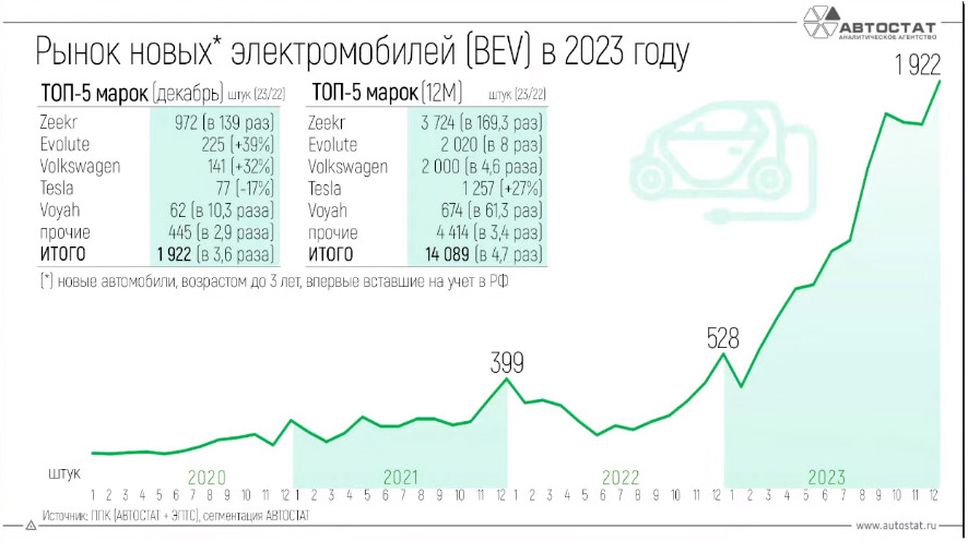 Odvojeno o električnim automobilima: njihova prodaja na ruskom tržištu porasla je skoro pet puta! Rezultat za 2023. je 14.089 novih vozila na baterije, iako je to samo 1,3% ukupnog tržišta. Zanimljivo, prvo mesto zauzima brend Zeekr (3.724), koji je predstavljen isključivo nezvaničnim isporukama. A tek na drugom mestu je ruski brend Evolute (2.020 automobila).