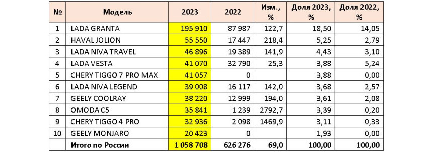 Među kineskim brendovima u 2023. Chery je na prvom mestu: 118.950 prodatih automobila. A ako uzmemo u obzir sve zavisne brendove (Omoda, Exeed, Jetour, Kaiyi, Jaecoo), onda je Chery već prodao skoro 222 hiljade automobila, a ovo je 21% celokupnog tržišta! Međutim, najpopularniji strani automobil u protekloj godini bio je krosover Haval Jolion proizveden u fabrici u Tuli: 55.550 automobila i drugo mesto u rangiranju modela, ispred samo mnogo jeftinije Lade Grante (195.910 jedinica).