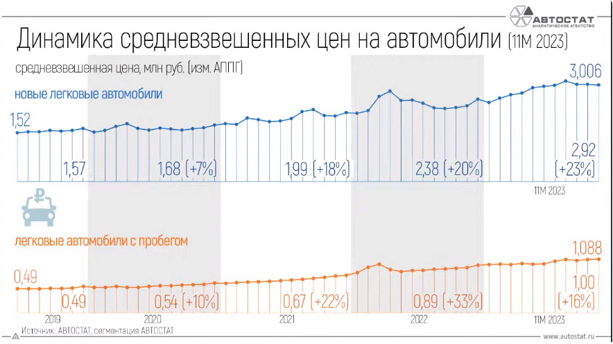Glavni pokretač rasta prodaje prošle godine bila je inflacija: kupci su uložili ušteđevinu u kupovinu automobila, čak i uprkos rastu cena. Prema podacima Autostata, za jedanaest meseci 2023. prosečna cena novog automobila u Rusiji porasla je za 23% i iznosila je 2,92 miliona rubalja. A izdavanje kredita tokom godine je više nego udvostručeno (za 111%) u rubljama. Štaviše, privatni vlasnici su bili ti koji su obezbedili glavni rast prodaje: učešće pravnih lica u strukturi tražnje smanjeno je sa 24,2% prethodne godine na 22,3% prošle godine.
